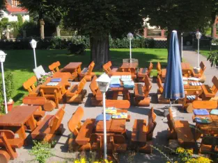 Der Biergarten bietet zur Zeit Sitzplätze für ca.100 Personen. Es besteht die Möglich-keit, den Biergarten zu erweitern(siehe Rasenfläche).Gleich neben dem Ausschank befindet sich ein Behältnis mit Polsterauflagen für die Bänke, damit einem gemütlichen Abend nichts im Wege steht.