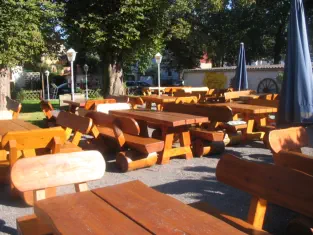 Der Biergarten bietet zur Zeit Sitzplätze für ca.100 Personen. Es besteht die Möglichkeit den Biergarten zu erweitern(siehe Rasenfläche).Gleich neben dem Ausschank befindet sich ein Behältnis mit Polsterauflagen für die Bänke, damit einem gemütlichen Abend nichts im Wege steht.